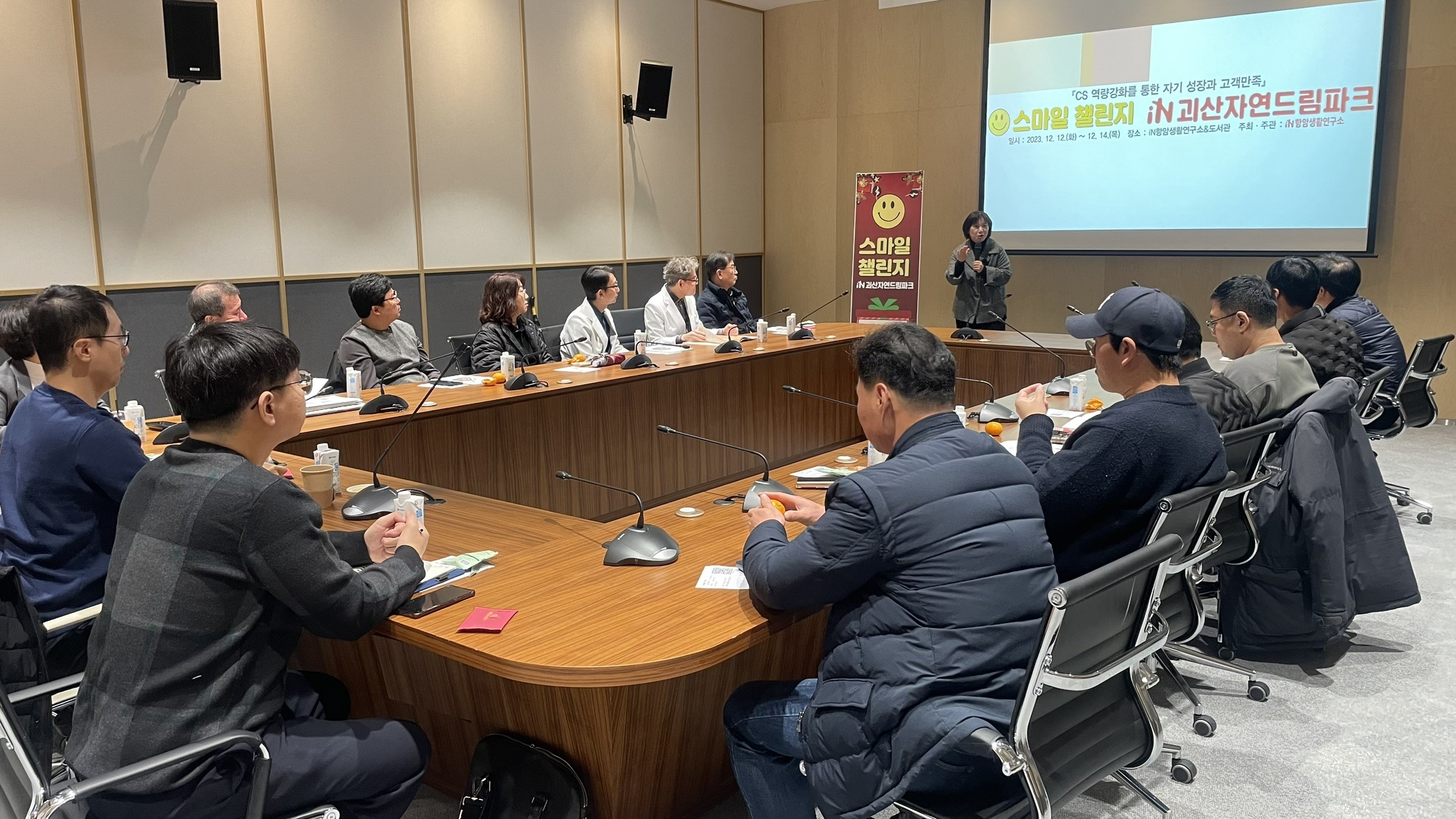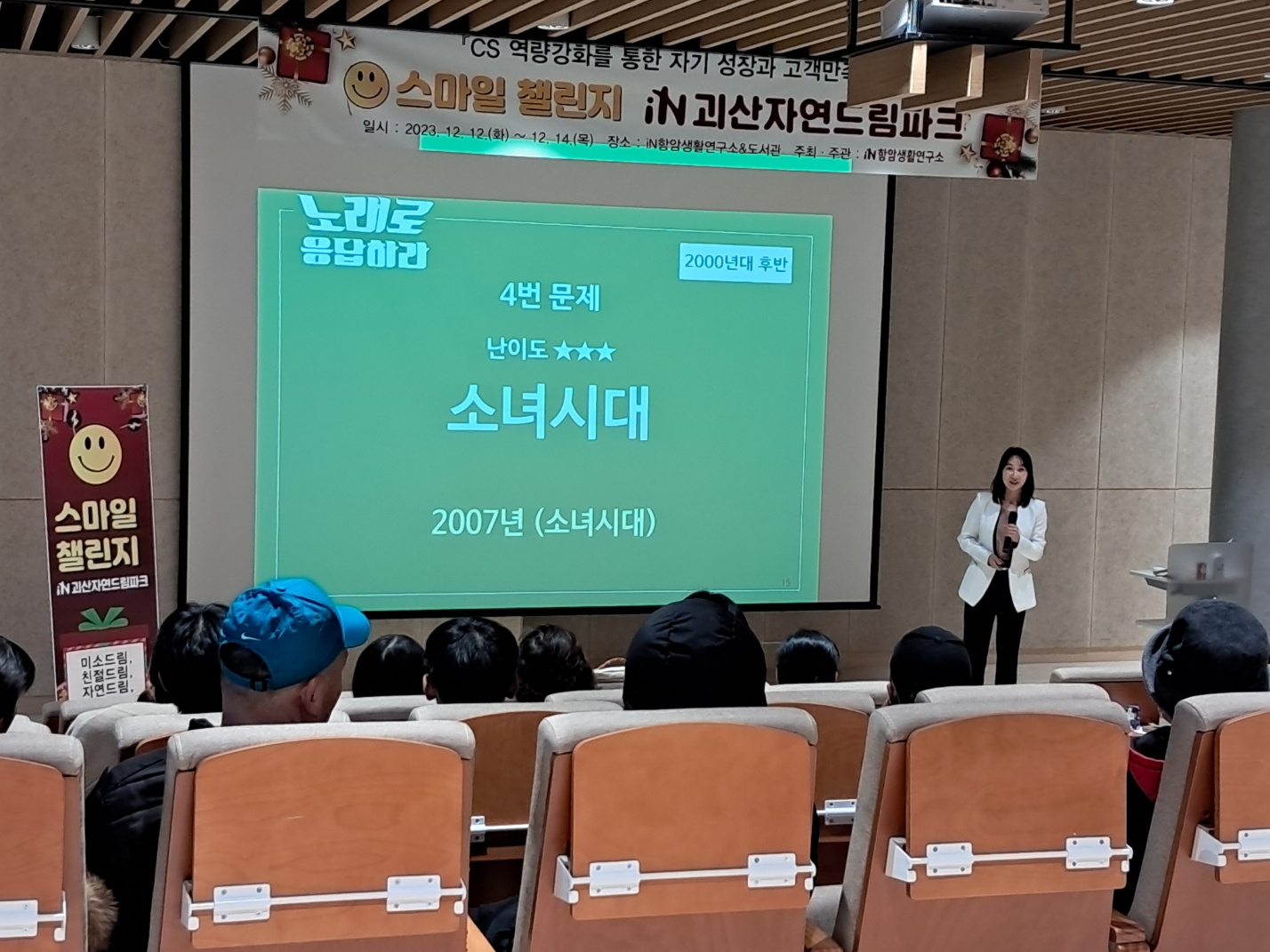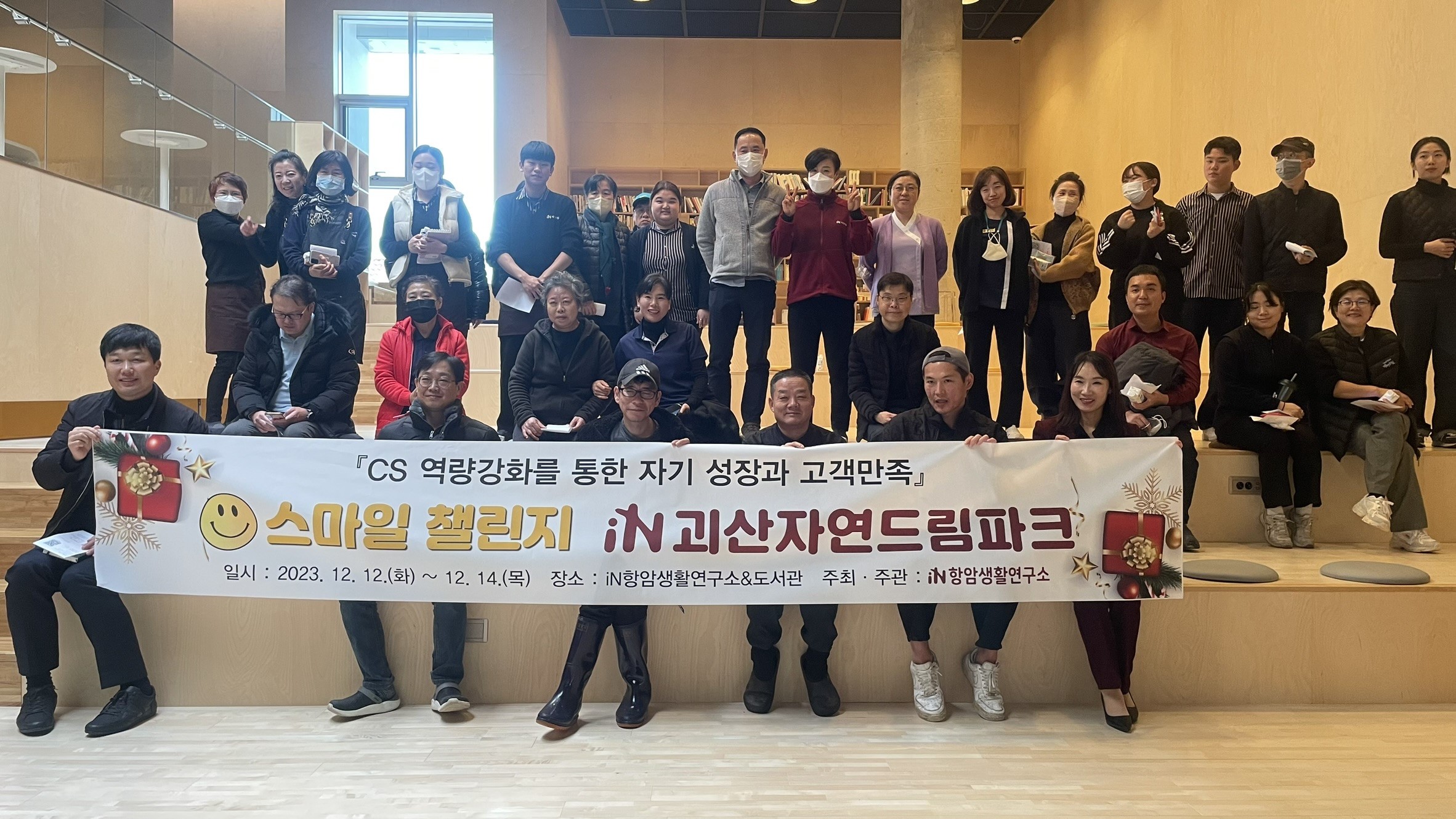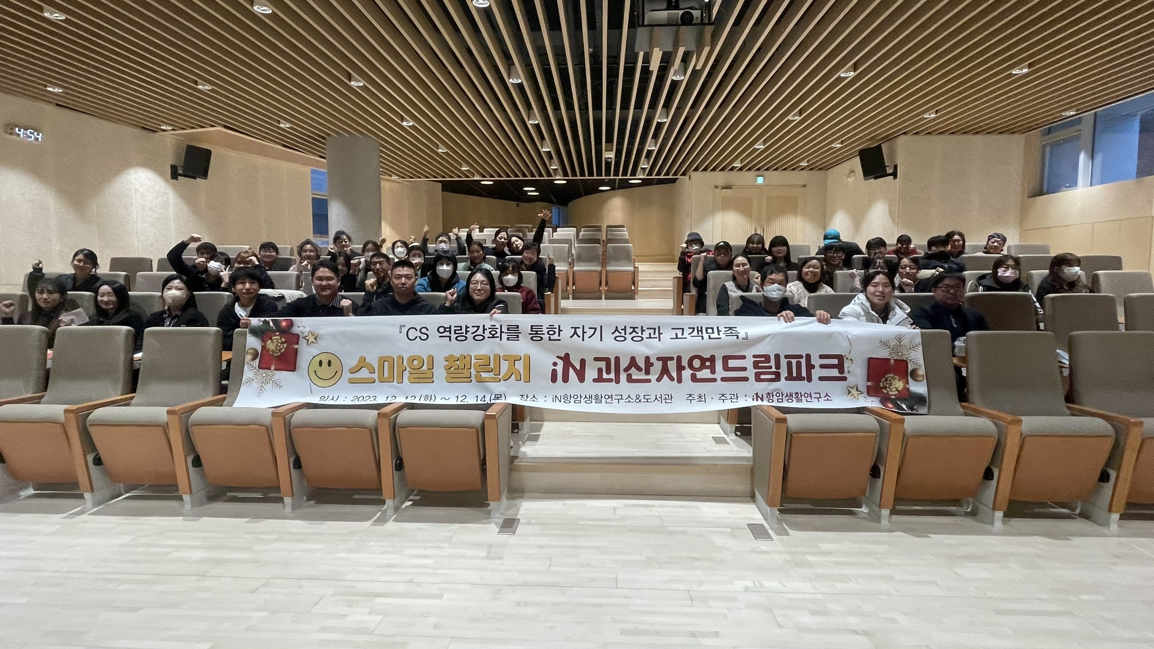 2023년 12월 12일(화) ~ 14일(목)까지 괴산자연드림파크 iN항암생활연구소&도서관에서 CS역량강화를 통한 자기성장과 고객만족을 목표로 하여 『스마일챌린지 iN 괴산자연드림파크』 교육이 진행되었다. iN항암생활연구소 주최 및 주관으로 괴산자연드림파크의 임직원을 대상으로 열렸다.