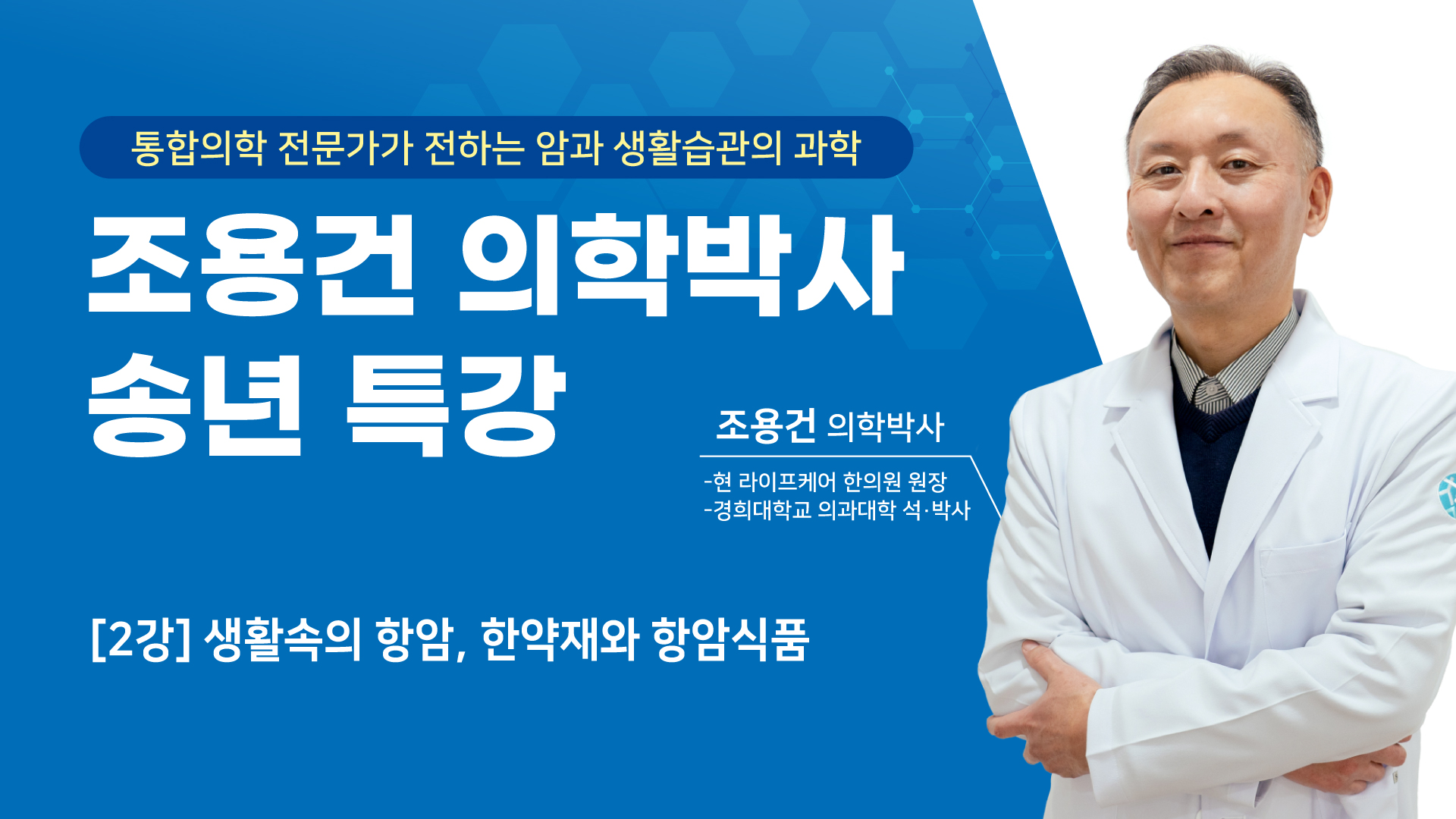 조용건 원장님의 제2강에서는 막연히 “몸에 좋다”고 알려진 식품과 한약재를, 우리 일상에서 어떻게 안전하고 올바르게 활용할 수 있을지를 구체적으로 짚어봅니다. 정보가 넘쳐나는 시대 속에서 무엇을 믿고, 어떻게 실천해야 할지 고민하는 분들을 위해 생활 속에서 적용 가능한 기준과 원리를 차분히 설명합니다.
