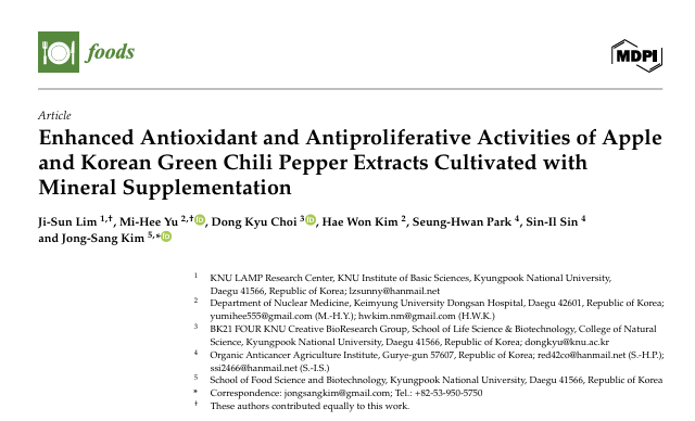 유기농항암연구소가 경북대학교, 계명대학교와의 공동연구를 통해, 자연드림 이온미네랄로 재배한 사과와 고추의 항산화 및 암 세포의 증식을 억제하는 효과를 과학적으로 입증하였다. 본 연구 결과는 2025년 7월, SCIE급 국제학술지 Foods에 “Enhanced Antioxidant Antiproliferative Activities of Apple Korean Green Chili Pepper Extracts Cultivated with Mineral Supplementation”이라는 제목으로 게재되었다.
