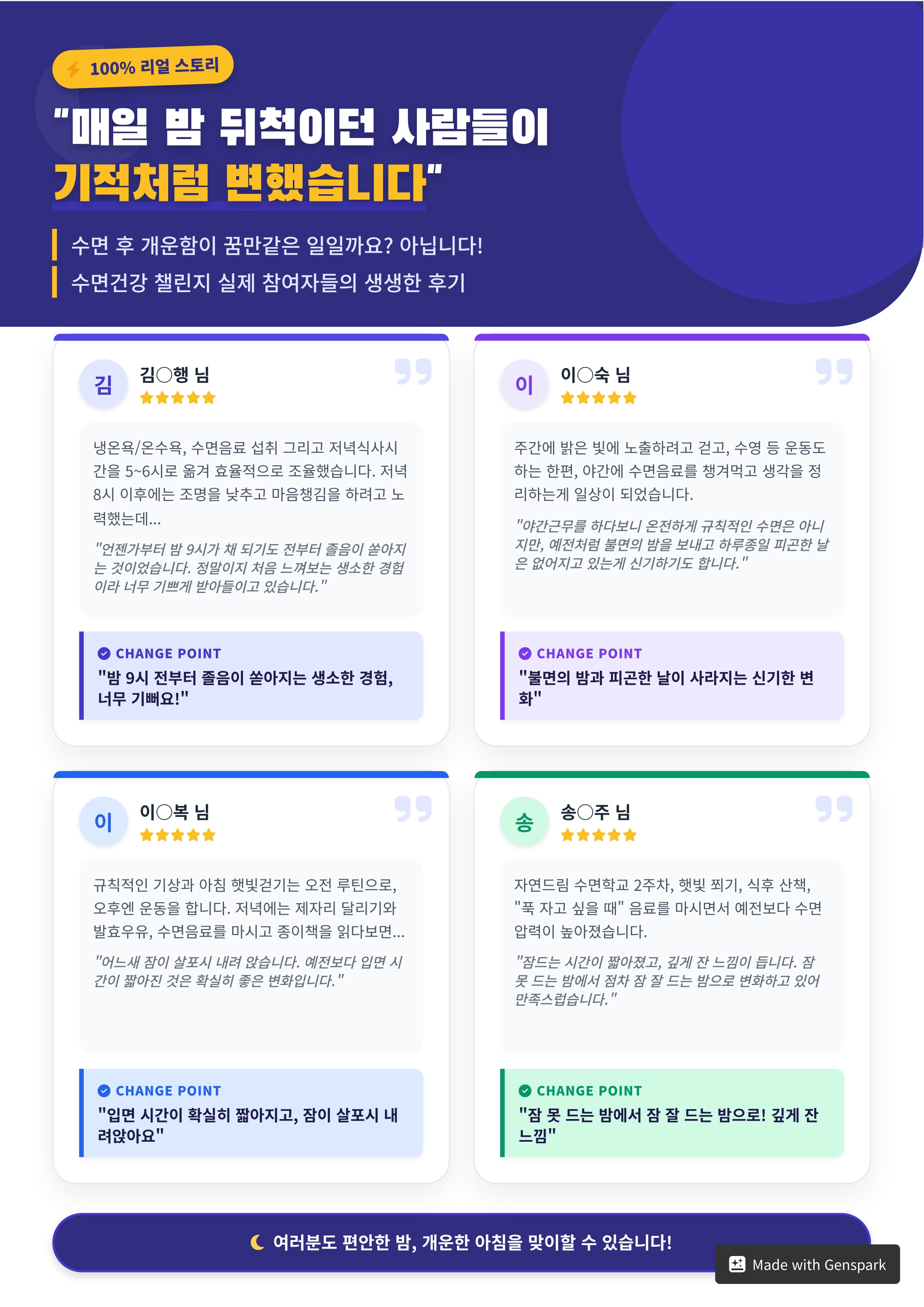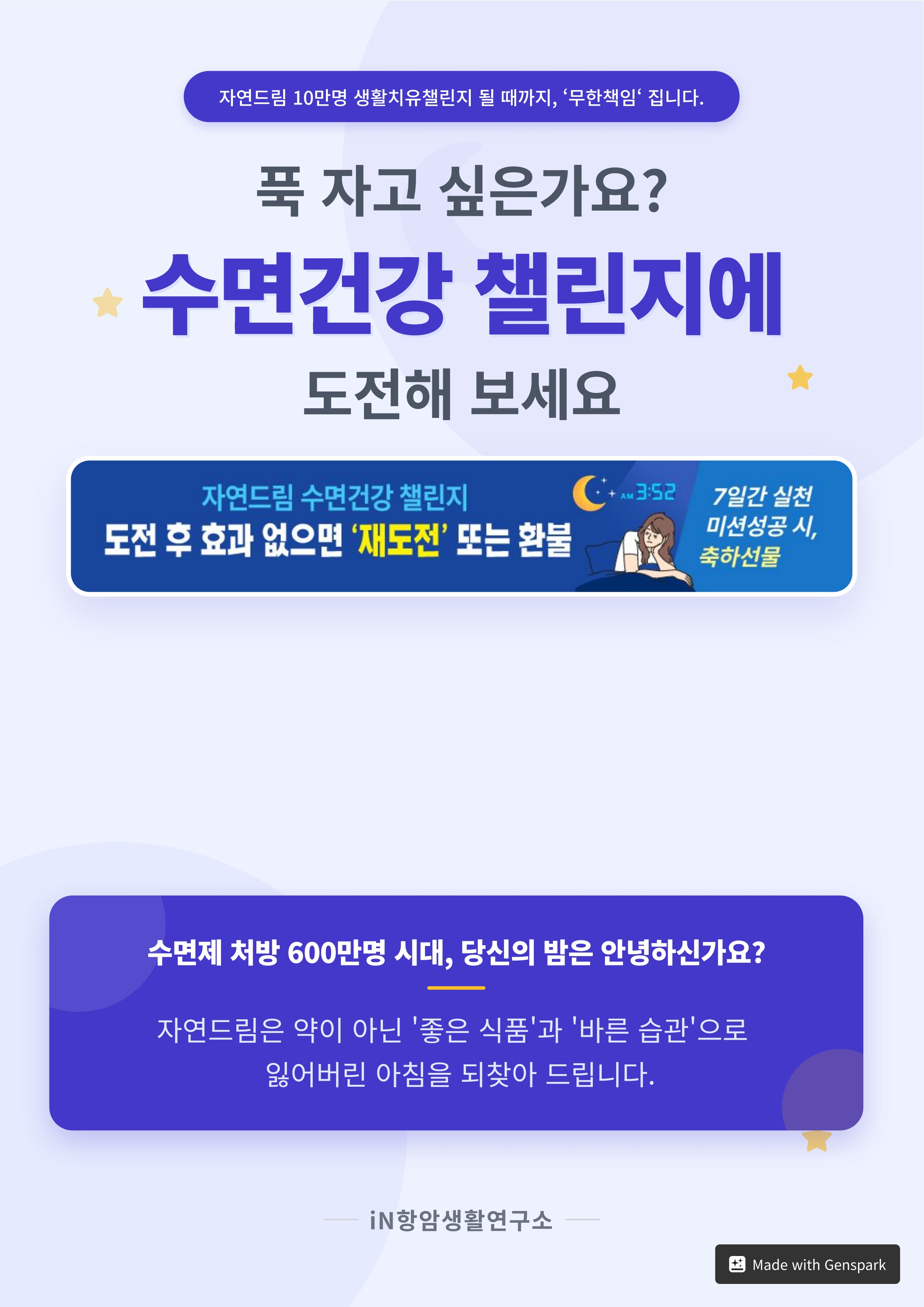생활치유챌린지는 누구나 실천 가능한 방법으로 수면의 질을 개선하고 삶의 균형을 되찾도록 설계되었습니다.