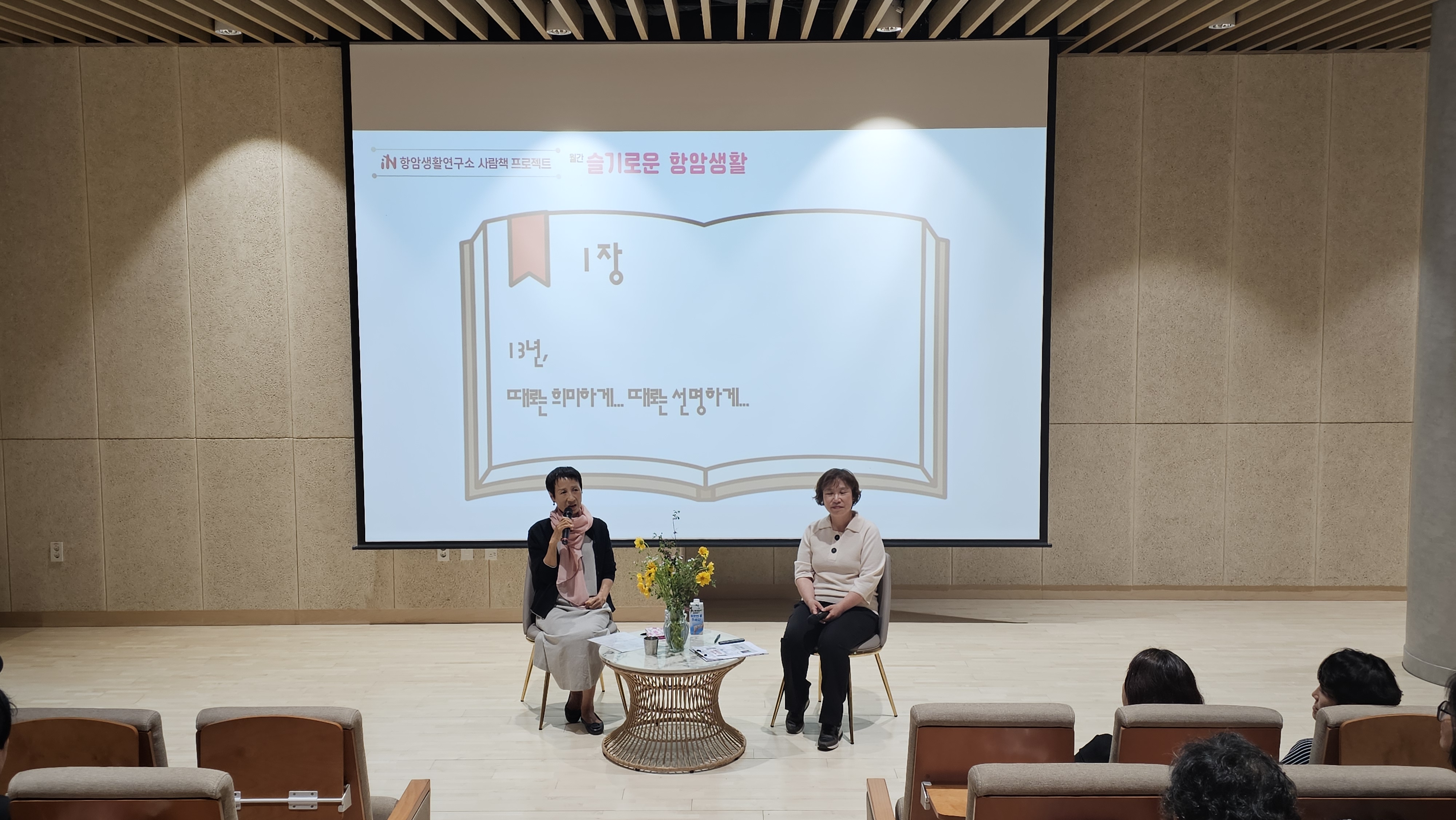 전체삭제지난 5월 29일(목) 오후 7시, 괴산자연드림파크 도서관동 라이프케어홀에서 『슬기로운 항암생활』 5월호 사람책(Human Book) 프로젝트가 성황리에 개최되었다. 사람책 프로젝트는 사람이 한 권의 책이 되어 자신의 이야기를 들려주는 시간으로 이날 자리에는 아이쿱재발방지요양병원 환자와 관계자 등 50여 명의 참가자들이 자리를 채우며 깊은 관심과 지지를 보여주었다.