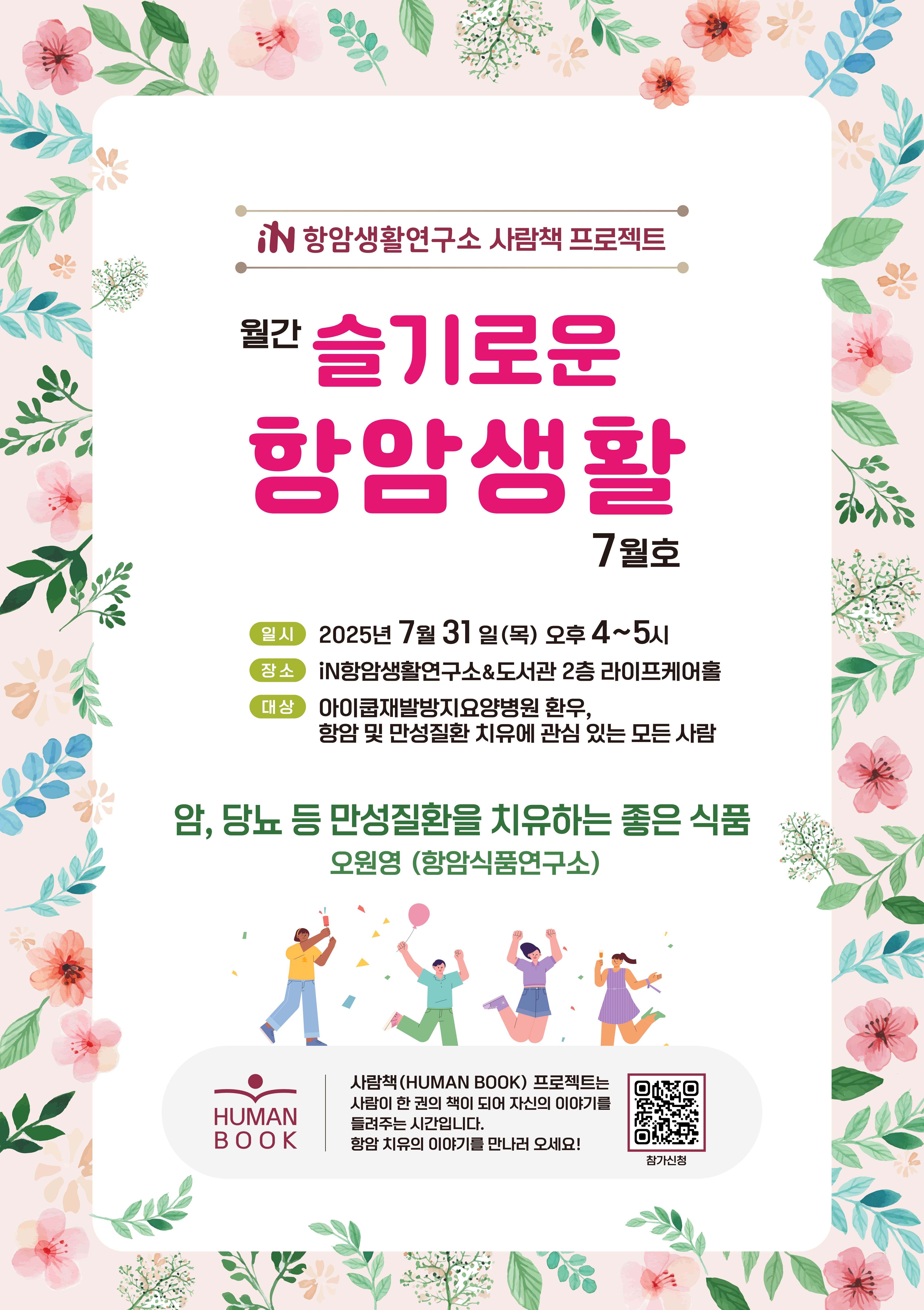 지난 5월부터 매 월 진행되고 있는 iN항암생활연구소의 사람책 프로젝트 월간 『슬기로운 항암생활』 은 누구나 건강한 삶을 위한 실천적 지식을 얻을 수 있는 열린 공간이다. 감동적인 치유와 힐링의 이야기, 올바른 정보와 실천의 지혜 등을 나눌 수 있는 사람책 프로젝트는 8월에도 진행될 예정이다.